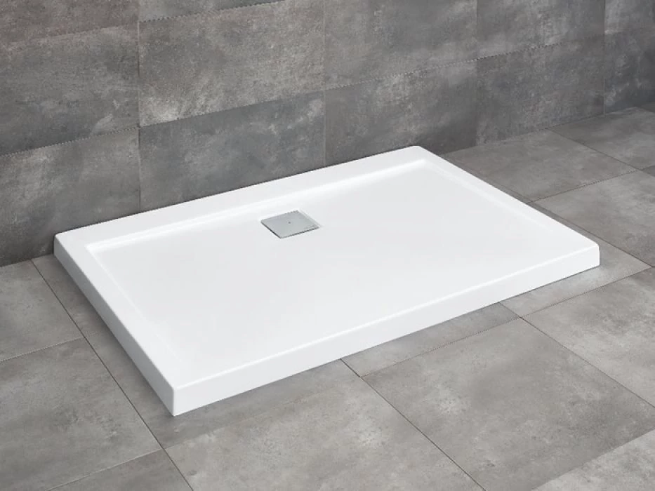 Szögletes aszimmetrikus kőhatású akril fehér zuhanytálca, közvetlenül a padlósíkra építhető.