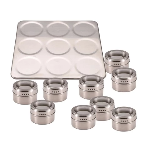 Rozsdamentes acél fűszertartó. 9db üvegcse 6.3x4.3cm méretben és egy tartó.