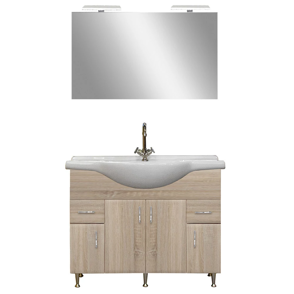 A fürdőszobabútor kevés helyet foglal viszont tágas alsó szekrénnyel és tükörrel (világítás nem tartozéka a terméknek) rendelkezik ahol kényelmesen elférnek a fürdőszobai pipere eszközök. Kevés helyigénye miatt kisebb fürdőszobák berendezésére is alkalmas, például panel lakásokban. A termék magas minőségű bútorlapból készül és színben passzoló élzárókkal van ellátva. A fürdőszoba bútor mosdóval együtt kapható.