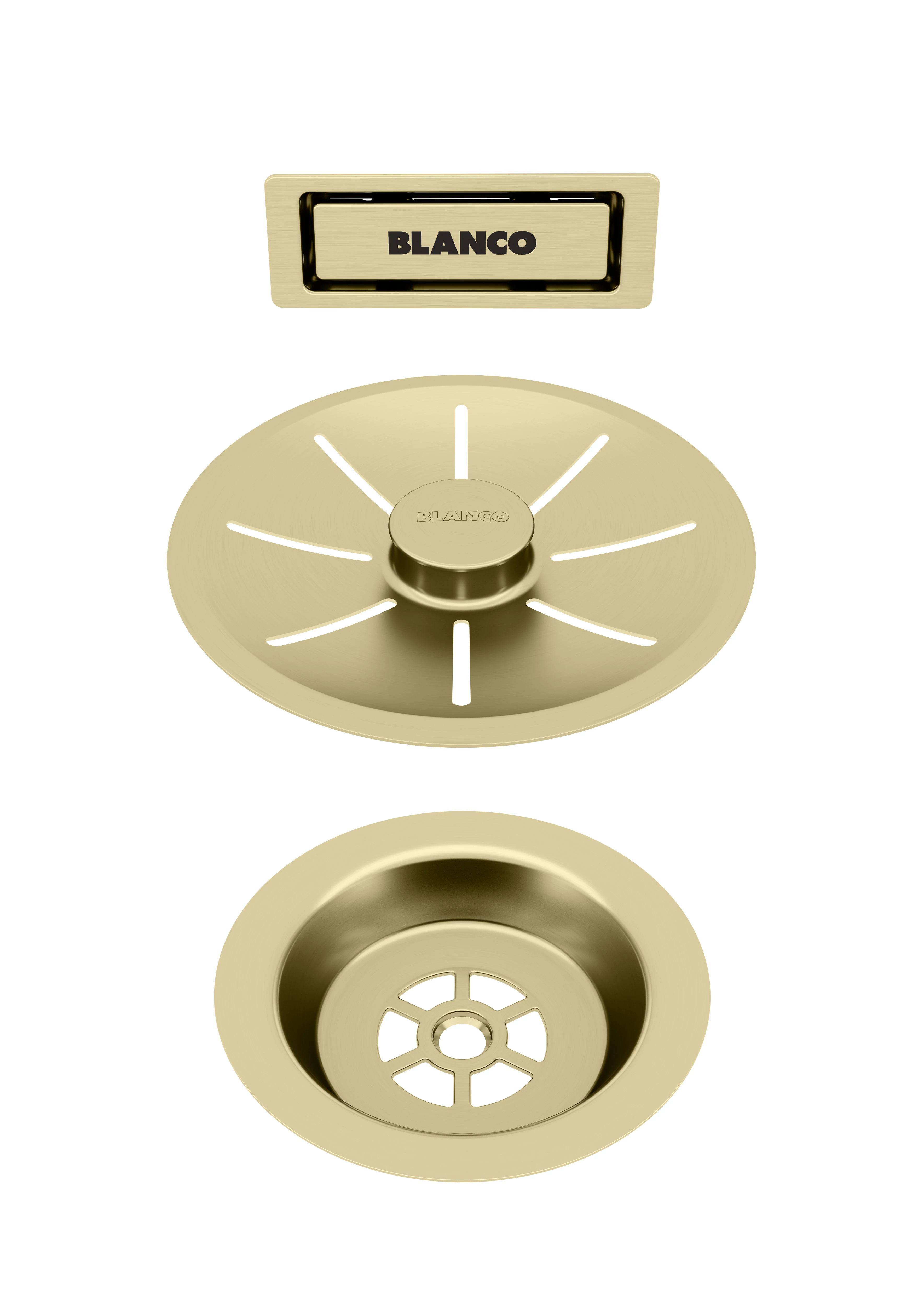 - Le- és túlfolyókészlet C-overflow túlfolyóval és InFino szűrőkosárral kétmedencés mosogatókhoz satin gold színben (kivéve BLANCO CLASSIMO)