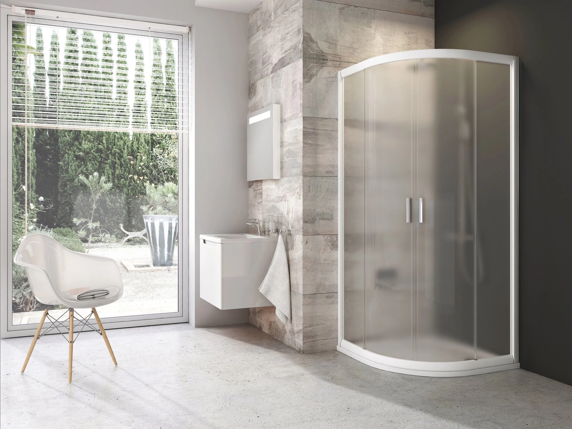 Négyrészes, negyedköríves Blix zuhanykabin szatén színben, átlátszó, edzett biztonsági üveggel és Ravak AntiCalc® vízlepergető réteggel. Tolóajtós rendszer.
