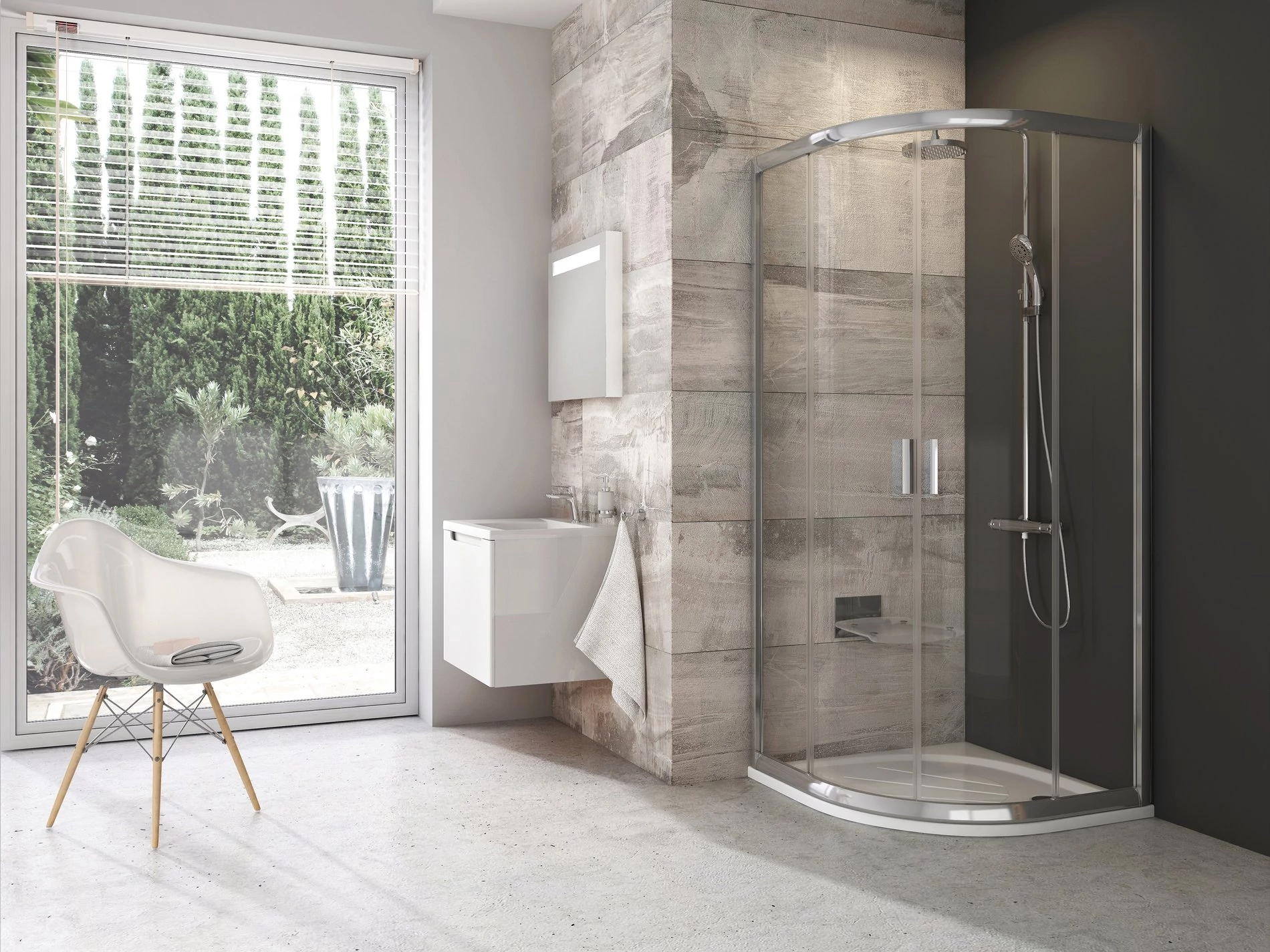 Négyrészes, negyedköríves Blix zuhanykabin krómhatású kerettel, átlátszó edzett biztonsági üveggel és Ravak AntiCalc® vízlepergető réteggel. Tolóajtós rendszer.