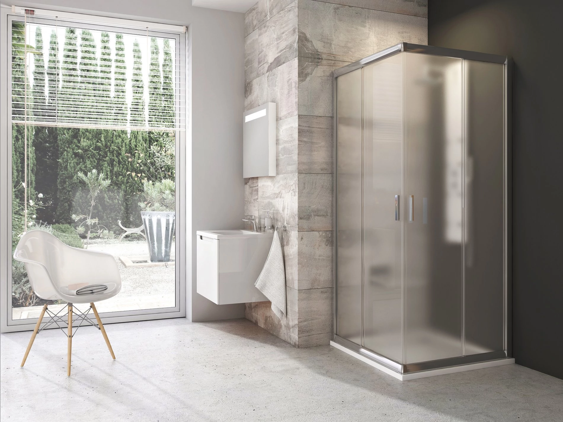 Négyrészes Blix sarok zuhanykabin, szatén kerettel, Grape edzett biztonsági üveggel és Ravak AntiCalc® vízlepergető réteggel. Tolóajtós rendszer.