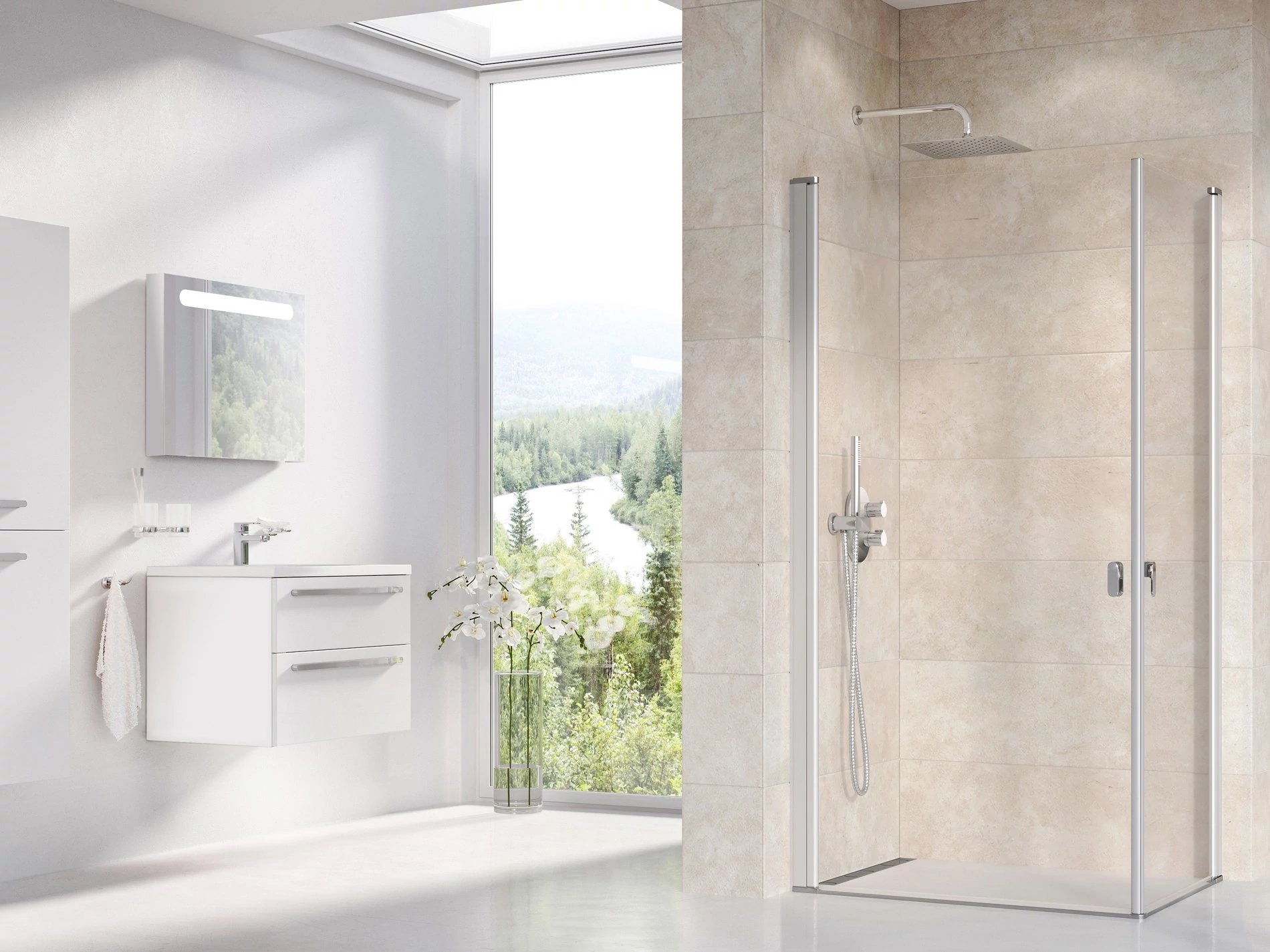 Chrome sarokzuhanykabin egy oldala, krómhatású kerettel, átlátszó, edzett biztonsági üveggel, Ravak Anticalc® vízlepergető réteggel. A zuhanykabin kialakításához a terméket CRV1, CRV2 zuhanyajtóval vagy CPS fix fallal kombinálják. Nyílóajtós rendszer.