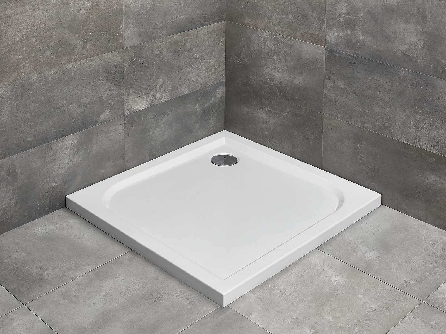 Szögletes, akril zuhanytálca állítható lábakkal.