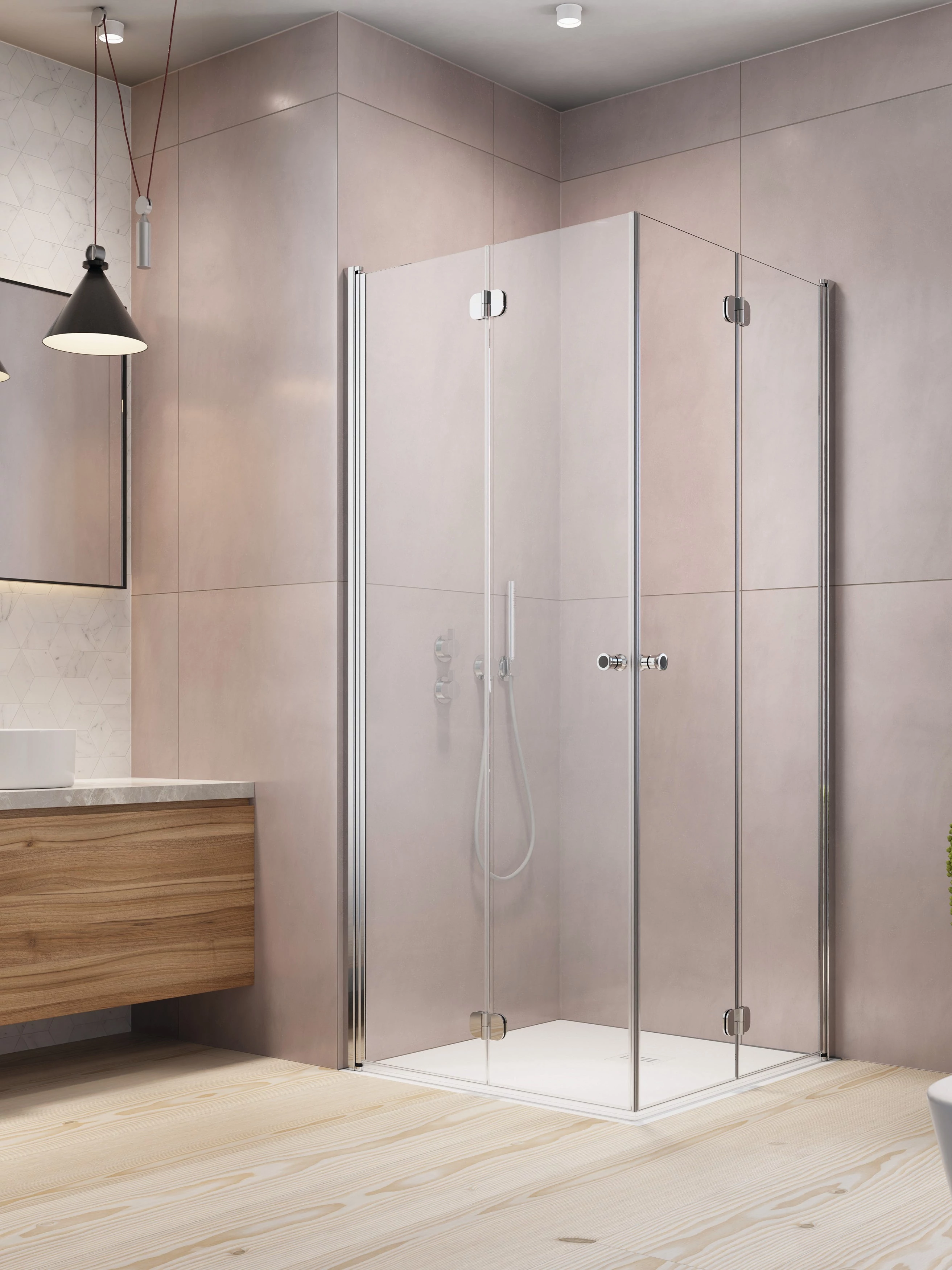 Szögletes, teljesen a falra hajtható dupla csuklós/lengőajtós zuhanykabin.