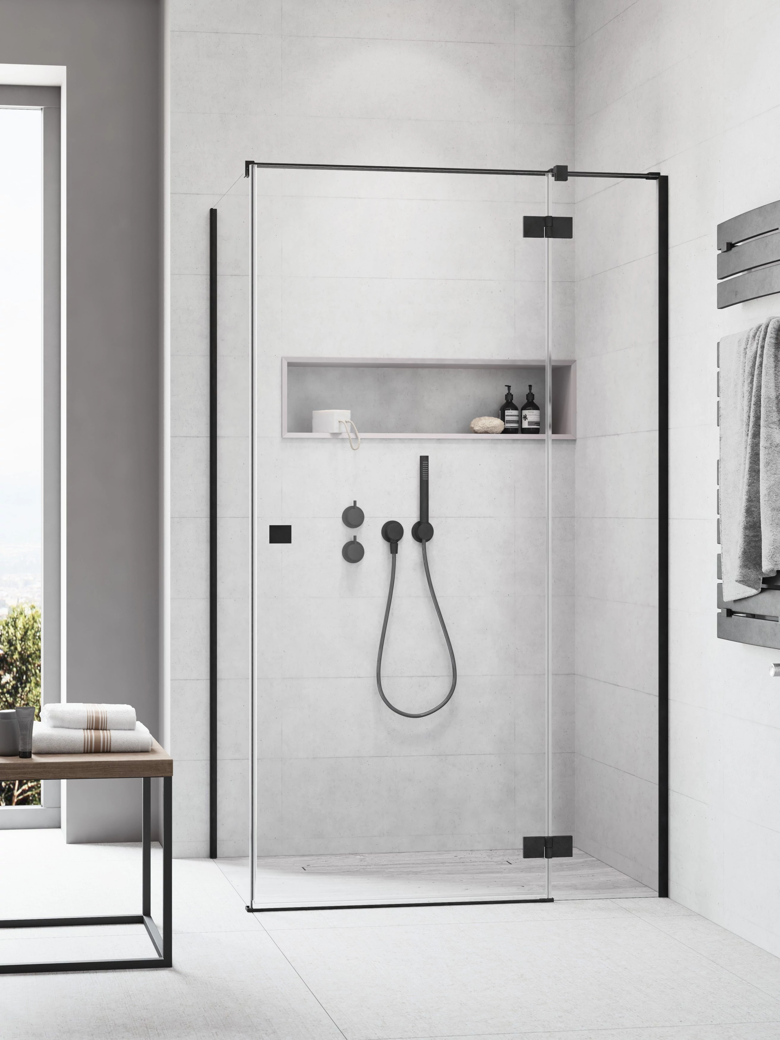 Szögletes fekete zuhanykabin kifelé nyíló ajtóval és egy fix oldalfallal.