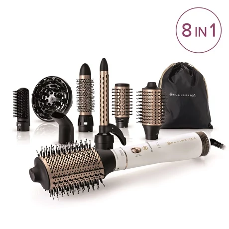 Forrólevegős hajformázó 8 tartozékkal a szárításhoz és a legkülönbözőbb stílusok létrehozásához - mindezt egyetlen mozdulattal. Egyetlen eszköz, amellyel szárítás közben határozott vonalú, hullámos hatást keltő, puha, sima vagy akár lágyan aláomló fürtöket alkothat, és amely volument és tartást ad frizurájának a hajszálak tövétől a végükig. A nyélen található rácsos gyűrű és a tartozékok kerámia- és keratinbevonata az egyenletes hőeloszlásnak kedvez, az eredmény pedig a védett, életerős és fényes haj. Az ionizátornak köszönhetően a haj hidratáltabbá válik, a hajszálak pedig kiegyenesednek. A két légáram/hőmérséklet kombinációval a termék minden típusú haj formázárása alkalmas. A hideg levegő funkció lehetővé teszi a hajformázás jobb rögzítését. Az 1000W-os teljesítmény kiváló szárítási és formázási teljesítményt tesz lehetővé. A csomagolás egy praktikus tárolózsákot is tartalmaz a készülék és a tartozékok számára. Utazáshoz ideális.