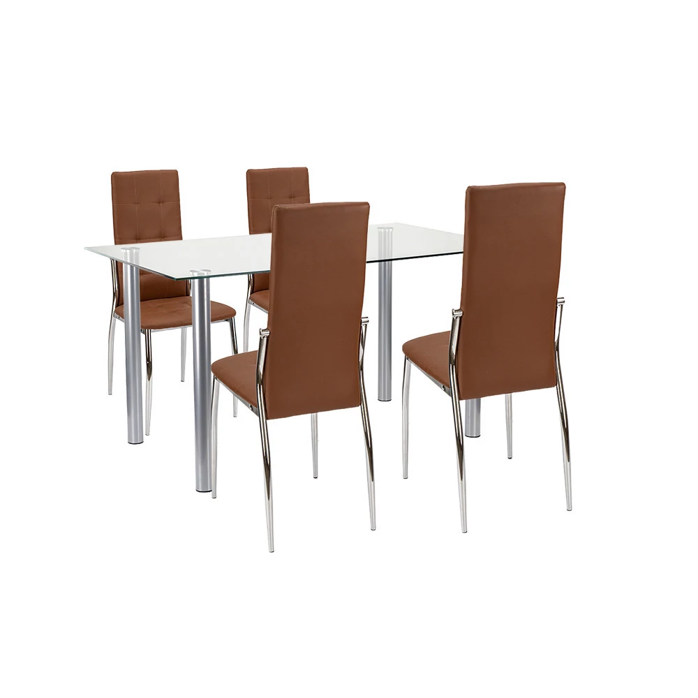 A Lina 4+1 étkező garnitúra egyedülállóan elegáns és praktikus választás minden otthon számára. A szett négy ergonomikus kialakítású étkezőszéket és egy modern megjelenésű étkezőasztalt tartalmaz, amelyek együtt egy letisztult, de kifinomult megjelenést kölcsönöznek a konyhának vagy az étkezőnek. A barna színű textilbőr és fém kombinációja időtálló, így garantáltan hosszú évekig hűséges társad lesz az otthoni étkezések során.