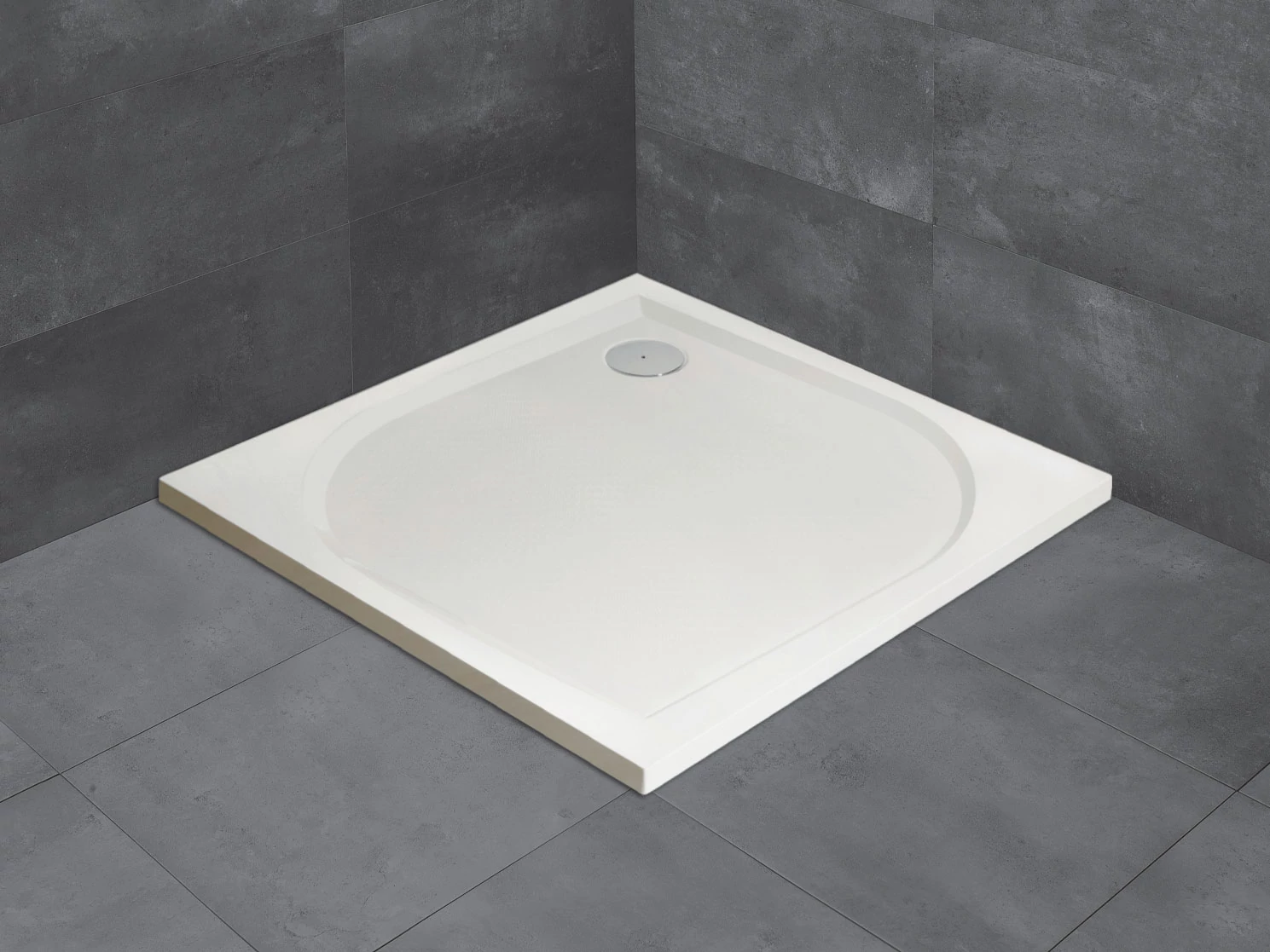 Szögletes kőhatású akril fehér zuhanytálca, közvetlenül a padlósíkra építhető.
