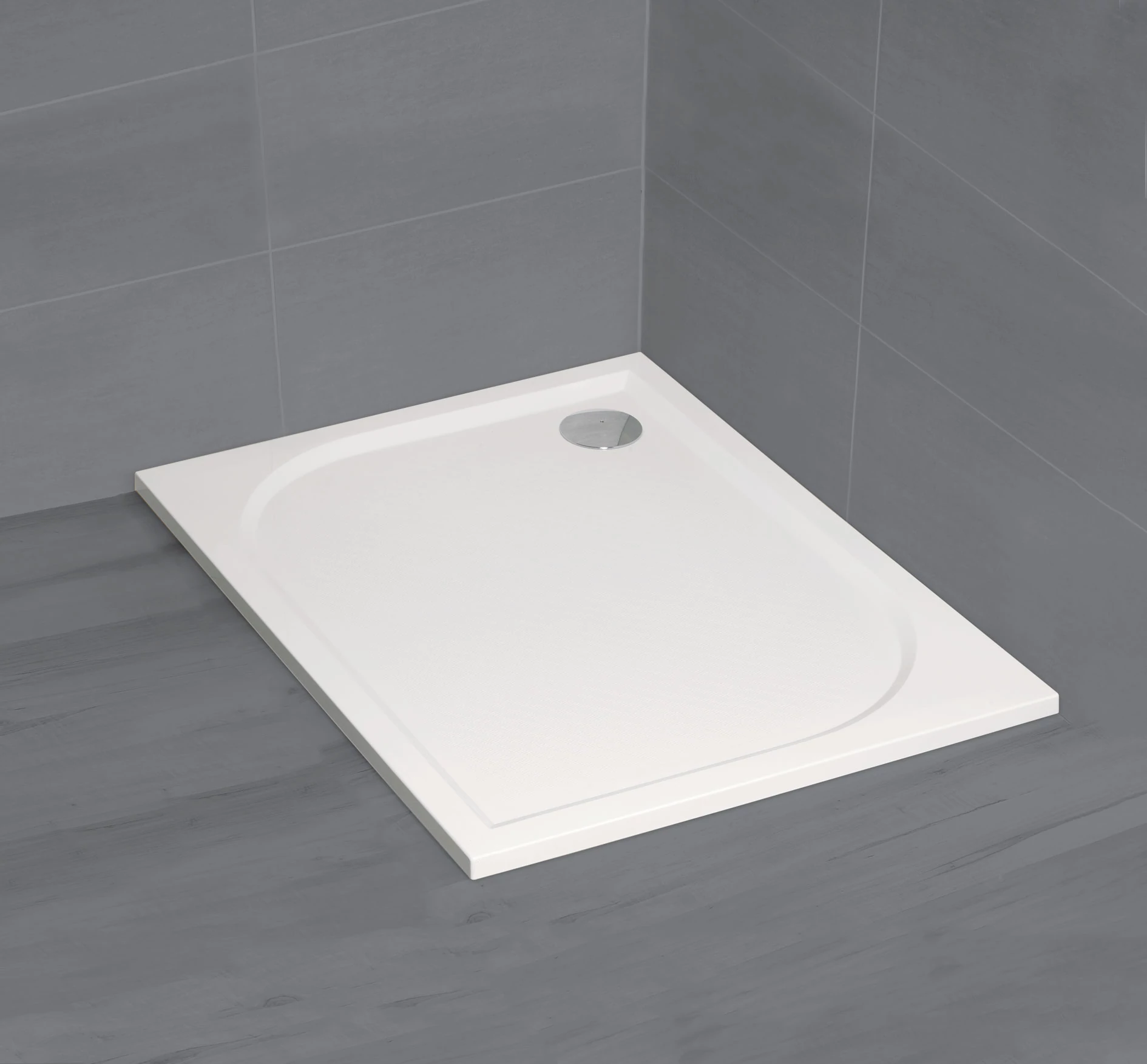 Aszimmetrikus szögletes, akril zuhanytálca állítható lábakkal.