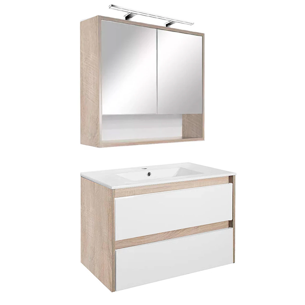 A szett részét képezi egy felfüggesztett kivitelű felső bútor is, amely 80 × 67 × 20 cm-es méretével további tárolási lehetőséget kínál. Tükrös ajtói mögött zárt polcos rész található, alul pedig egy praktikus nyitott polc kapott helyet, így a leggyakrabban használt tárgyak is kézre esnek. A felső egység is sonoma tölgy színű, magas minőségű bútorlapból készült.