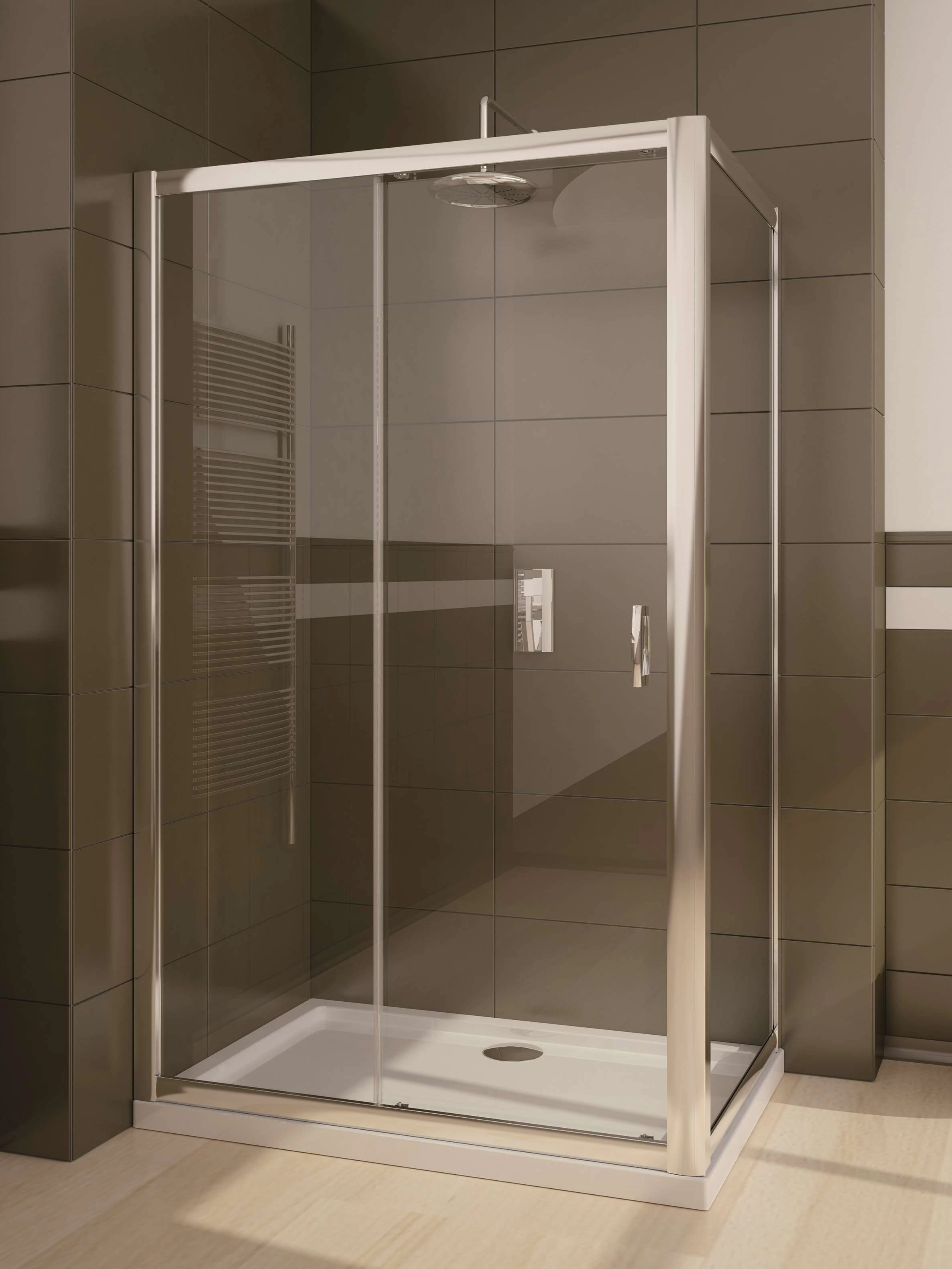 Szögletes zuhanykabin görgős tolóajtóval és egy fix oldalfallal.