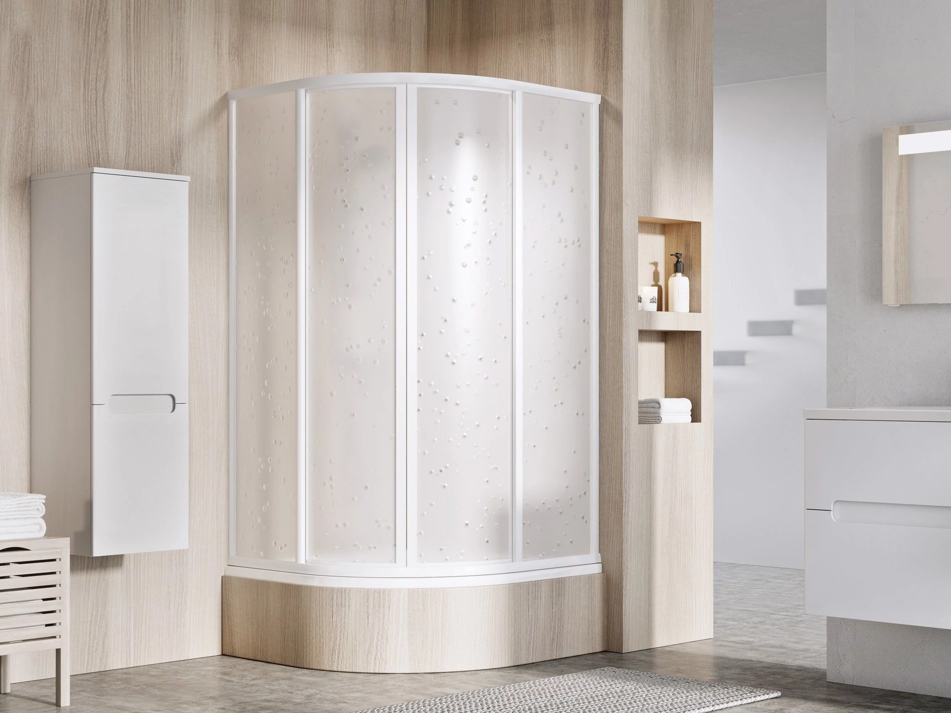 Négyrészes, negyedköríves Blix Slim zuhanykabin fényes króm kivitelben, átlátszó edzett biztonsági üveggel és Ravak AntiCalc® vízlepergető réteggel. Tolóajtós rendszer.