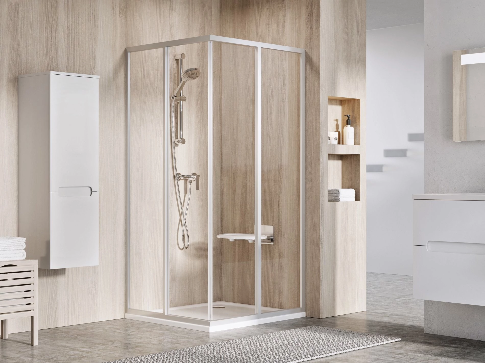 Négyrészes Blix Slim sarok zuhanykabin, fényes krómhatásü kerettel, átlátszó edzett biztonsági üveggel és Ravak AntiCalc® vízlepergető réteggel. Tolóajtós rendszer.