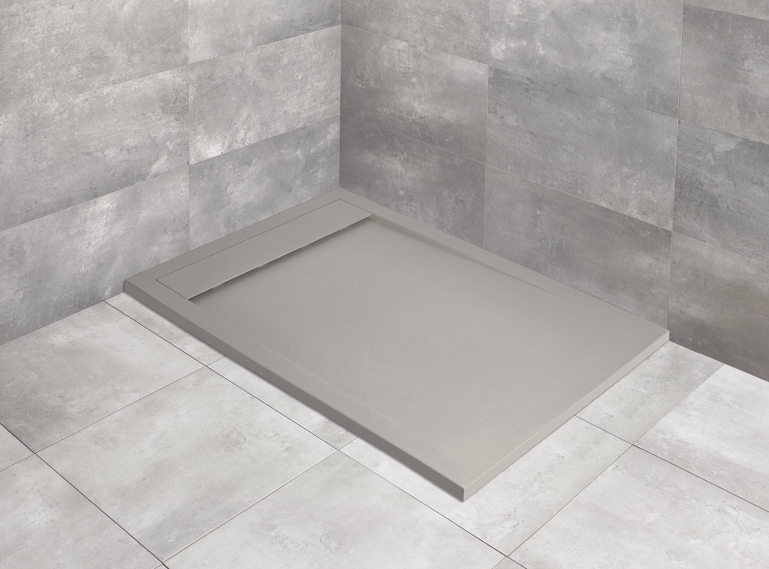 Szögletes, aszimmetrikus műmárvány cemento zuhanytálca, mely közvetlenül a padlósíkra építhető vagy padlósíkba süllyeszthető.
