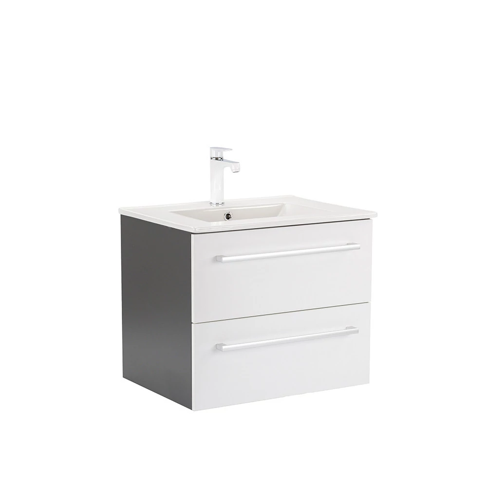 A Vario Clam 60 komplett fürdőszobabútor egy stílusos és praktikus választás modern fürdőszobához. Kompakt méretei ideálisak kisebb és közepes méretű fürdőszobákba is, és a fém fogantyú profil patinás hatást, az antracit-fehér színű dizájn elegáns megjelenést kölcsönöz a térnek. A csillapítós fiókzáródás és a felfüggesztett kivitel a kényelmet és könnyű tisztántartást szolgálja, míg a minőségi anyagok hosszú élettartamot biztosítanak.