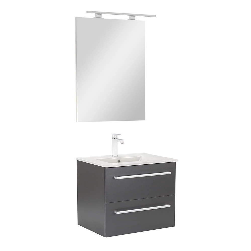A Vario Clam 60 komplett fürdőszobabútor egy stílusos és praktikus választás modern fürdőszobához. Kompakt méretei ideálisak kisebb és közepes méretű fürdőszobákba is, és a fém fogantyú profil patinás hatást, a antracit-antracit színű dizájn elegáns megjelenést kölcsönöz a térnek. A csillapítós fiókzáródás és a felfüggesztett kivitel a kényelmet és könnyű tisztántartást szolgálja, míg a minőségi anyagok hosszú élettartamot biztosítanak.