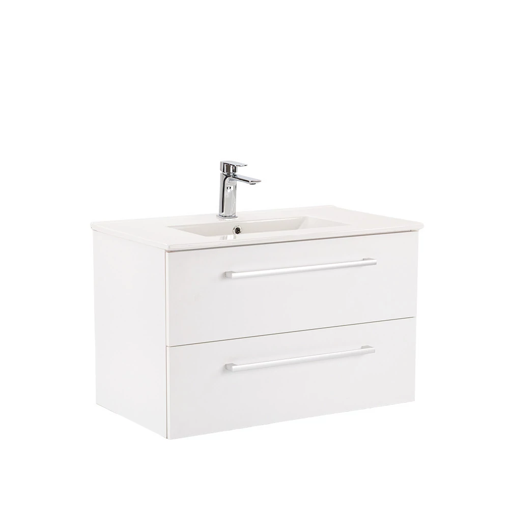 A Vario Clam 80 komplett fürdőszobabútor egy stílusos és praktikus választás modern fürdőszobához. Kompakt méretei ideálisak kisebb és közepes méretű fürdőszobákba is, és a fém fogantyú profil patinás hatást, az fehér-fehér színű dizájn elegáns megjelenést kölcsönöz a térnek. A csillapítós fiókzáródás és a felfüggesztett kivitel a kényelmet és könnyű tisztántartást szolgálja, míg a minőségi anyagok hosszú élettartamot biztosítanak.