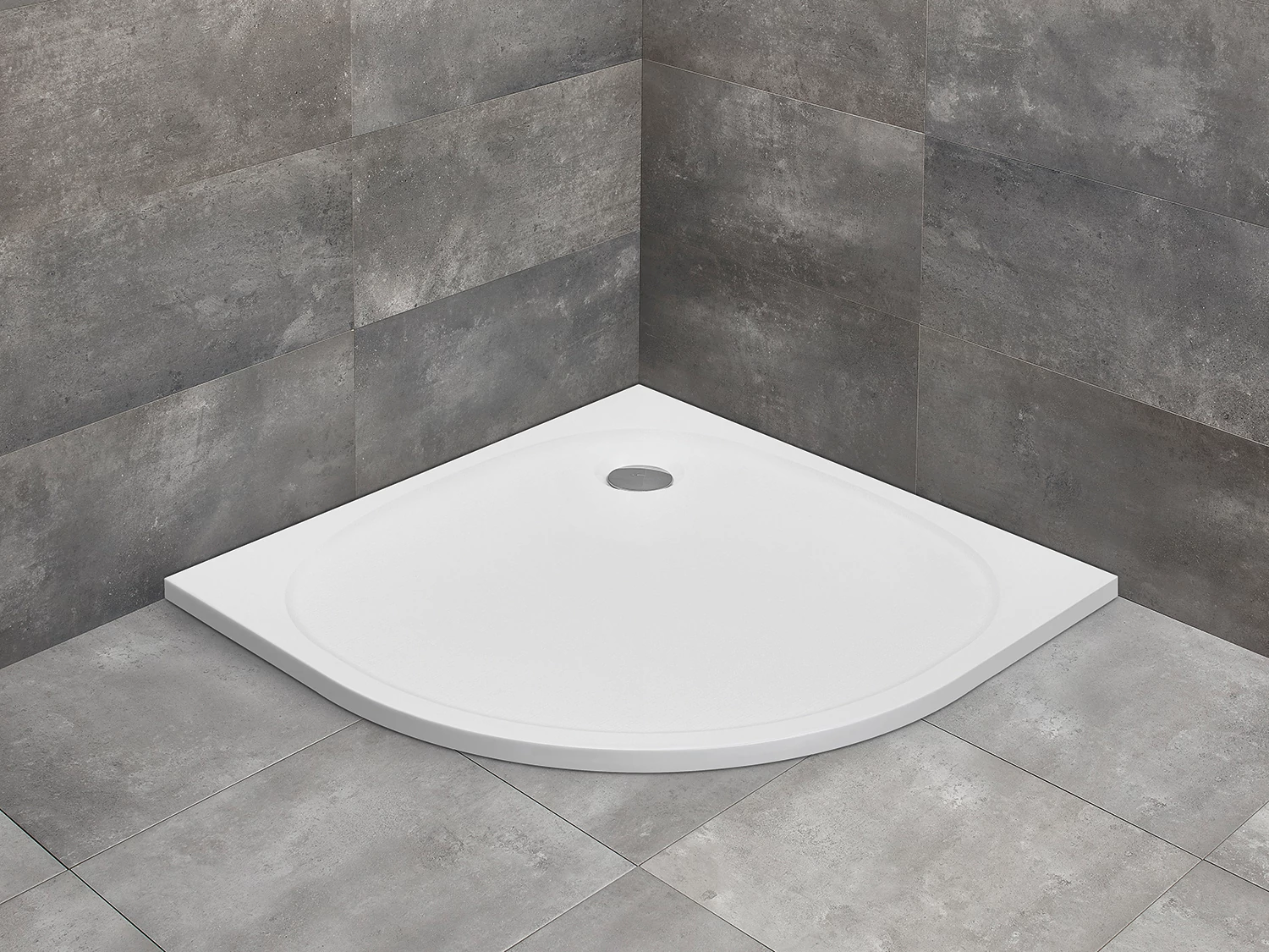 Íves betonszürke műmárvány zuhanytálca, mely közvetlenül a padlósíkra építhető vagy padlósíkba süllyeszthető.
